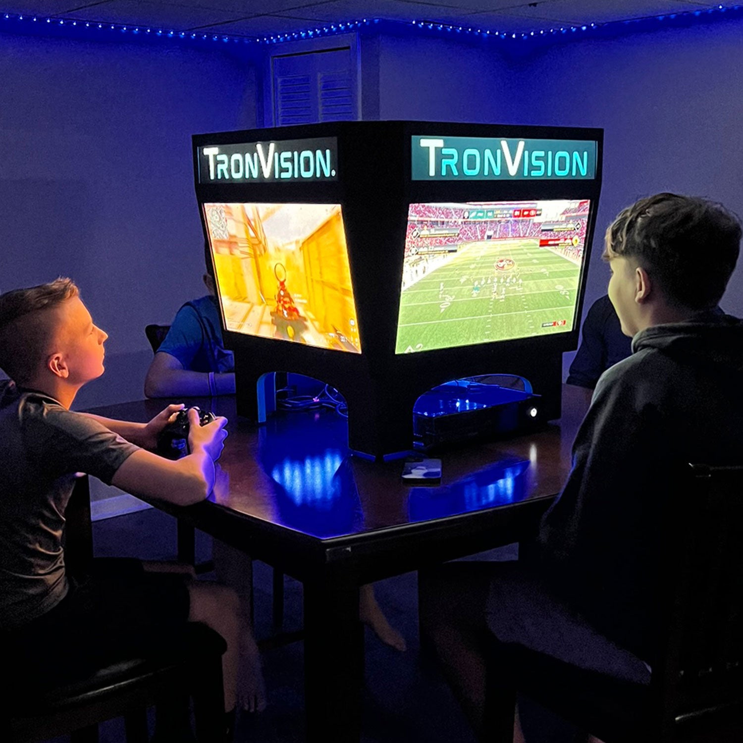 Transform your gaming environment with the TronVision™ Gamer Package. The Gamer Package delivers an immersive, multi-screen setup designed for serious gamers who demand next-level visuals, ultra-responsive gameplay, and a fully customizable experience. TronVision™ Gamer Jumbotron allows you to play multiple games at once, stream your favorite content, or expand your field of view across all four screens for an epic, high-impact gaming experience. Whether you’re dominating in multiplayer battles, racing through open worlds, or streaming to your audience, this setup puts you at the center of the action.